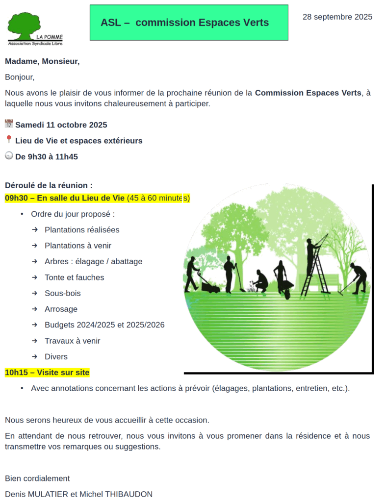 Nous avons le plaisir de vous informer de la prochaine réunion de la Commission Espaces Verts, le samedi 11 octobre 2025 et nous vous invitions à nous rejoindre pour faire le point sur nos plantations.