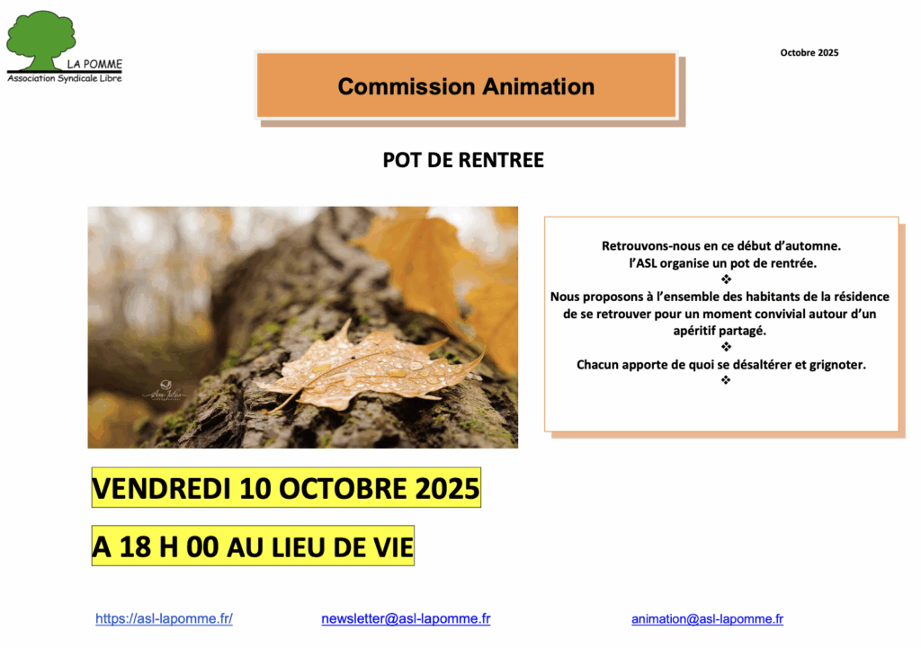 L’équipe animation est heureuse de vous inviter au pot de rentrée automnal le vendredi 10 octobre 2025 à 18 h.